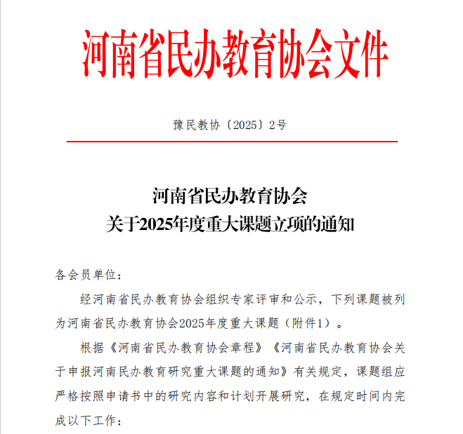 7月2日,河南省民办教育协会2025年度重大课题立项名单正式公布,作为该项目设立首年,全省仅立项32项,我校许玲玲副校长主持的《基于乡村振兴战略视角的河南民办本科高校社会责任研究》成功获批立项。