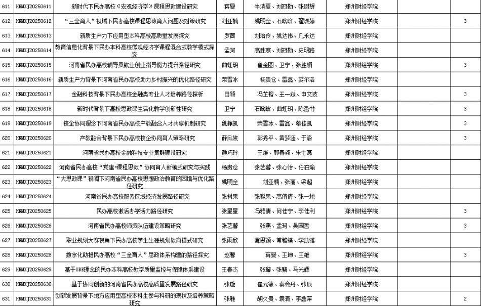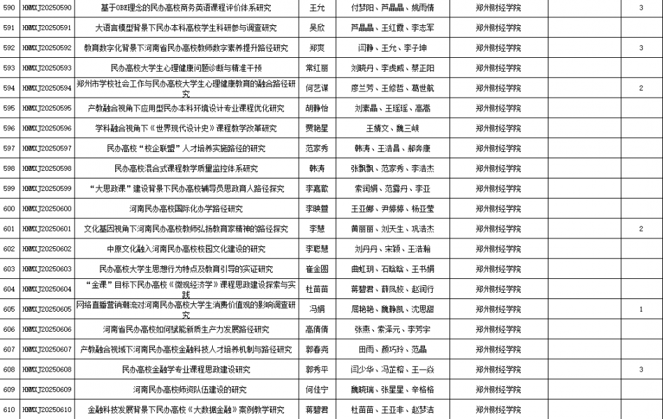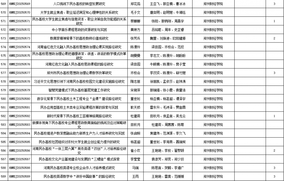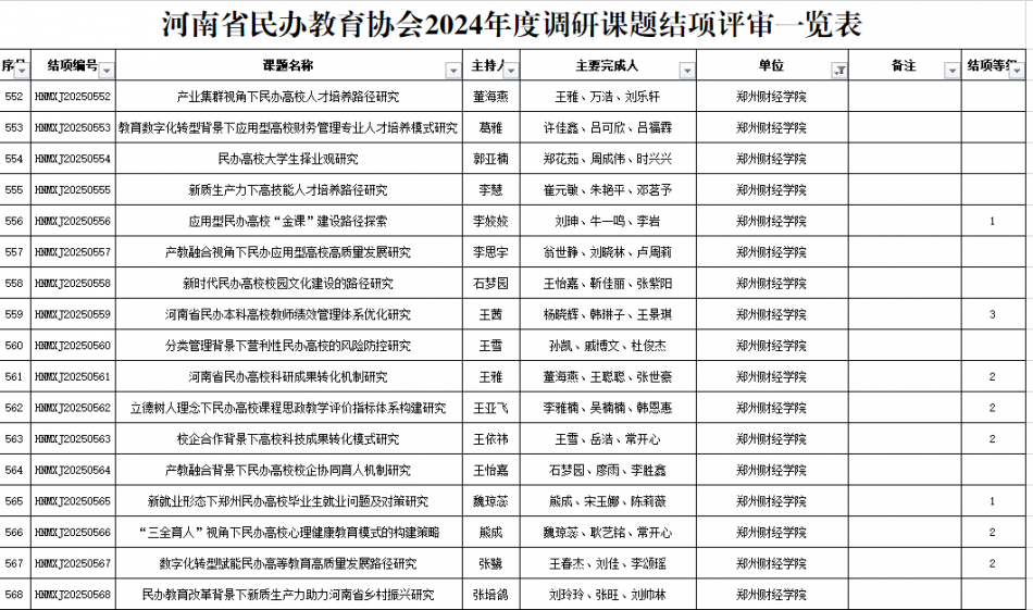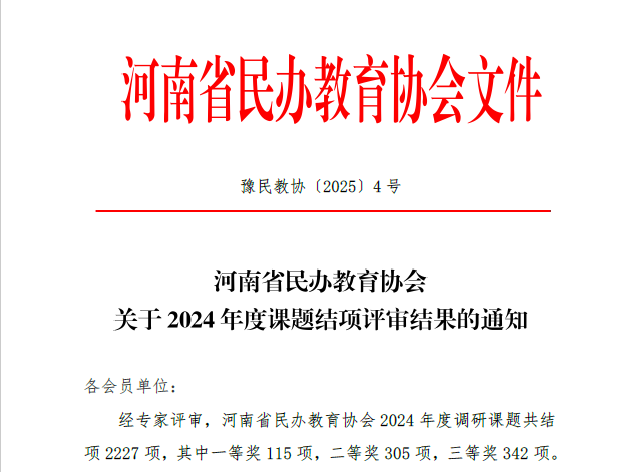 近日,河南省民办教育协会发布《关于2024年度课题结项评审结果的通知》(豫民教协[2025]4号),我校87项河南民办教育协会2024年度课题获准结项,其中一等奖5项,二等奖11项,三等奖18项。